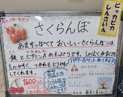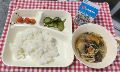 今日は、牛肉と野菜のいため?、きゅうりのしょうがづけ、さくらんぼ、ご飯、牛乳でした。1年生はさくらんぼを初めて食べたという子も多かったです。
