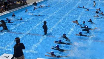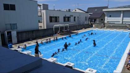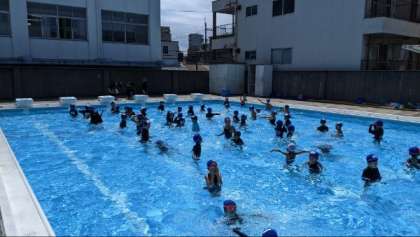 水慣れをしてからビート板を使って浮く練習もしていました。