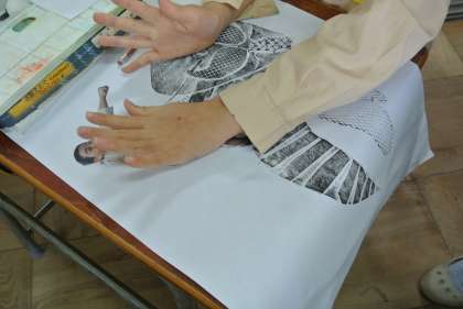 今日は3年2組で図画工作科の授業研究会を行いました。紙版画の技法で、ダイナミックに昆虫を刷り上げ、その昆虫にぶら下がったり、乗っかっている自分を組み合わせ、さらにバックの模様を工夫していくというかなり複雑な工程の作品です。