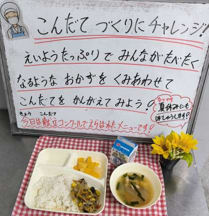 今日は、給食献立コンクールで優秀賞に選ばれた献立でした。夏野菜飯、パワースープ、トロピカルゼリー、牛乳です。