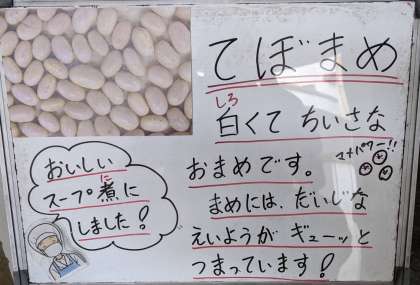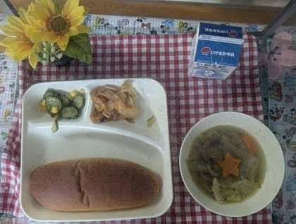 今日は、鶏肉とてぼ豆のスープ煮、ベーコンとじゃがいものチーズ焼き、きゅうりとコーンのサラダ、黒糖パン、牛乳でした。