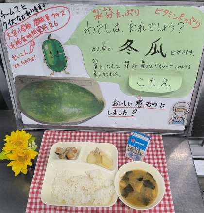 今日は、さけのしょうゆ風味焼き、みそ汁、とうがんの煮もの、ご飯、牛乳でした。