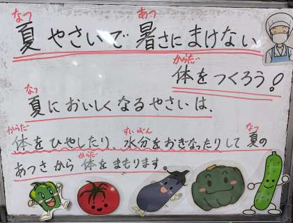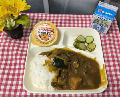 今日は、夏野菜カレーライス、きゅうりのピクルス、みかんゼリー、牛乳でした。