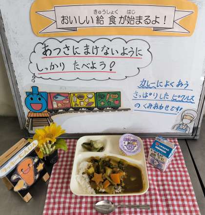 8月は暑くても食べやすい組み合わせにしています。今日はビーフカレーライス、野菜のピクルス、ぶどうゼリー、牛乳でした。