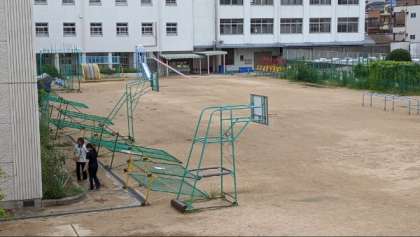 教職員で協力して、台風で物が飛んでいかないように、運動場やビオトープなどを片付けました。