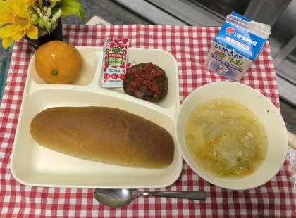 今日は、焼きバンバーグ、豆乳スープ、冷凍みかん、黒糖パン、牛乳でした。