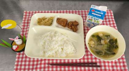今日は、ヤンニョムチキン、とうふのスープ、切干しだいこんのナムル、ごはん、牛乳でした。