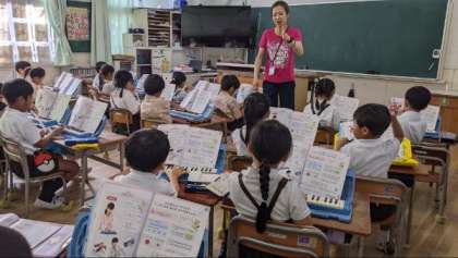 鍵盤ハーモニカを使って学習していました。