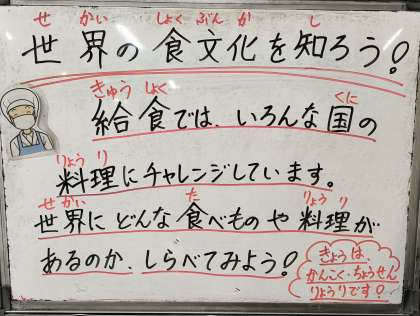 今日は、プルコギ、トック、もやしのナムル、ご飯、牛乳でした。給食を通して世界の食文化にも、ふれられるように考えています。