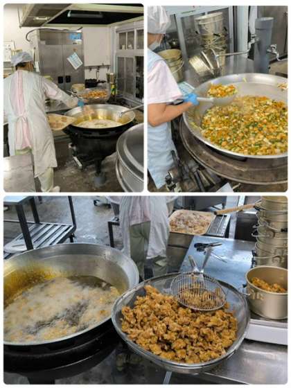 給食室で一つ一つ衣をつけ丁寧に揚げています。