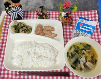今日は、鶏肉のチリソース焼き、焼き豚のスープ、ツナとさんどまめのオイスターソースいため、ご飯、牛乳でした。オイスターソースは牡蠣をつかった中華料理でよく使われる調味料です。