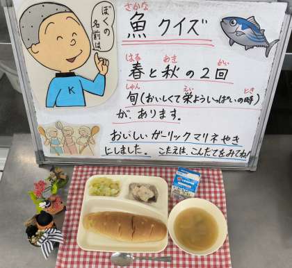 今日は、かつおのガーリックマリネ焼き、ウインナーとじゃがいものスープ、キャベツのサラダ、おさつパン、牛乳でした。