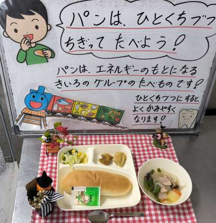 鶏肉のカレー風味焼き、スープ煮、野菜のソテー、コッペパン、ソフトマーガリン、牛乳でした。運動会のあともしっかり食べてくれていました。