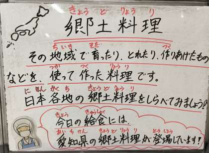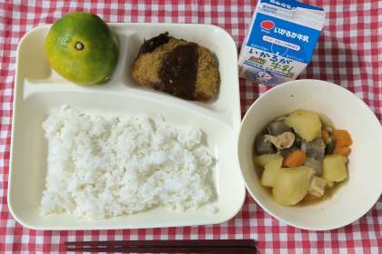 今日は、みそカツ、じゃがいもと野菜の煮もの、みかん、ご飯、牛乳でした。給食では、郷土料理にも取り組んでいます。みそカツの味噌ダレには愛知県で昔から使われてきた八丁味噌を使用しています。