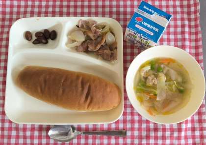 今日は、豚肉のバジル焼き、スープ、うずら豆のグラッセ、黒糖パン、牛乳でした。