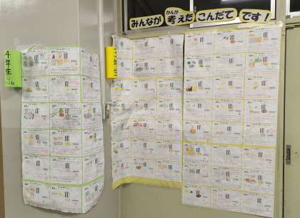 夏休みに1〜4年生に募集した給食献立を1階食育ルーム前に展示しています。ユニークなものや、お店で出せそうなメニューなどよく考えられたメニューが勢揃いです。
