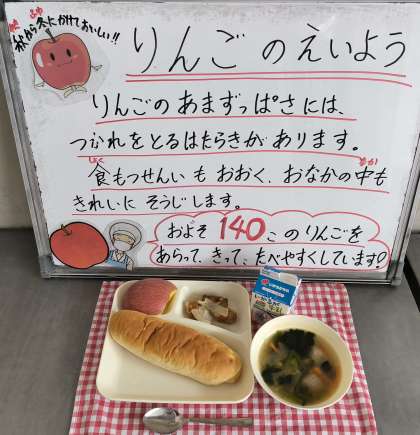 今日は、さけのマリネ、肉だんごと押麦のスープ、りんご、おさつパン、牛乳でした。
