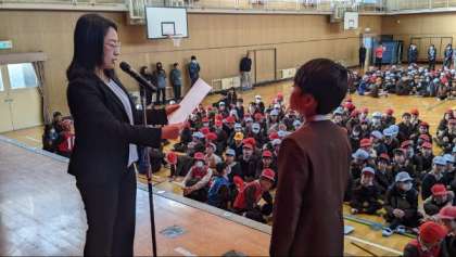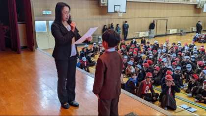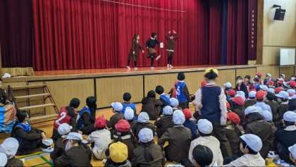 集会委員会の児童が、ジェスチャーゲームをしていました。