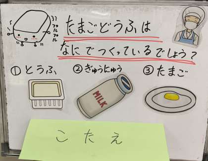 今日は、たまごどうふ、ひとくちがんもと野菜の煮もの、キャベツとピーマンのそぼろいため、ご飯、牛乳でした。