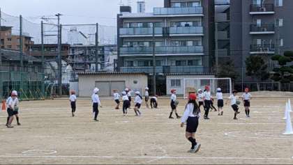 体育「ボールゲーム」チームでパスをつないでゴールをめざしていました。