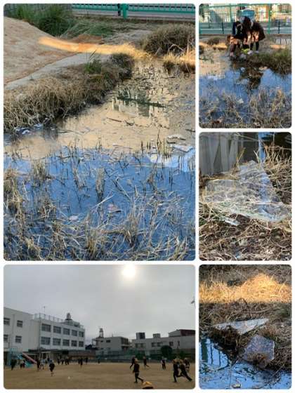 思わず肩をすくめてしまいますが、子どもは風の子ですね。たくさんの子どもたちが寒さにも負けず、運動場で元気に遊んだり、ビオトープに来て氷を観察したりしていました。