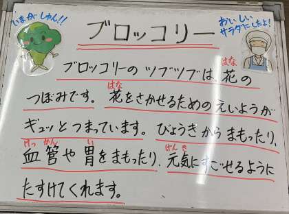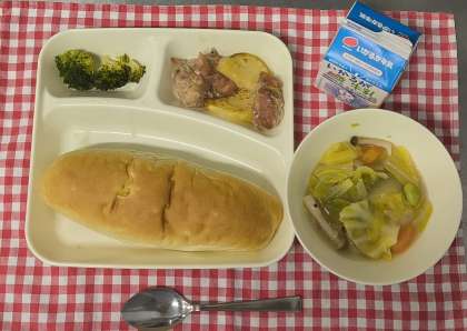 今日は、鶏肉とじゃがいものガーリック焼き、スープ煮、ブロッコリーのサラダ、おさつパン、牛乳でした。