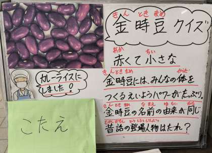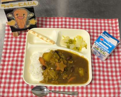 今日は、豚肉と金時豆のカレーライス、はくさいのピクルス、棒チーズ、牛乳でした。