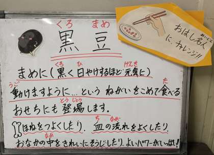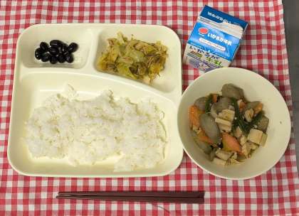 今日は、筑前煮、キャベツのごまいため、黒豆の煮もの、ご飯、牛乳でした。