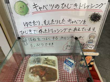 今日は、ハヤシライス、キャベツのひじきドレッシング、ミニフィッシュ、牛乳でした。
