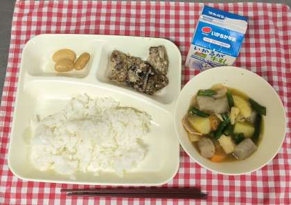 今日は、くじらのたつたあげ、豚肉と野菜の煮もの、白花豆の煮物、ご飯、牛乳でした。