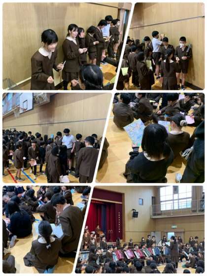 在校生へのプレゼントは、「名探偵コナン」と「天地人」の合奏と手作りの雑巾。