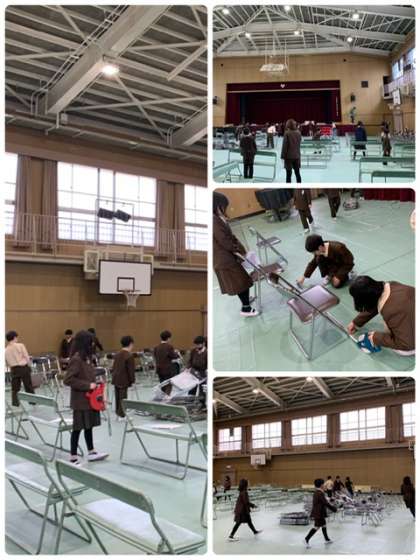 先生の指示に従いテキパキ動く子、式場図を見ながら進んで準備をする子、友だち同士協力して進める子、誰一人サボることなくよく動く子どもたち。
