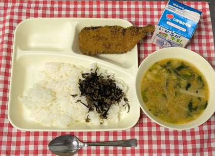 今日は、いわしフライ、みそ汁、牛ひじきそぼろ、ご飯、牛乳でした。