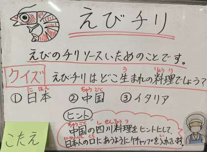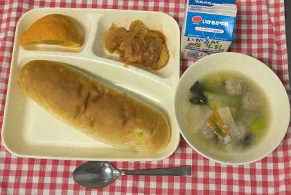 今日は、えびのチリソースいため、中華がゆ、デコポン、おさつパン、牛乳でした。