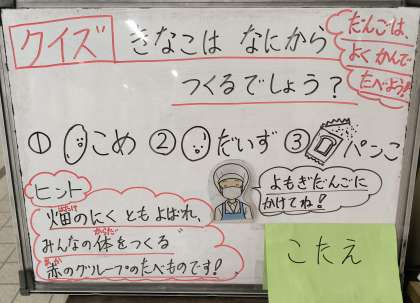 今日は豚肉と野菜のいためもの、五目汁、よもぎだんご(きな粉)、ご飯、牛乳でした。クイズの答えは?大豆です。