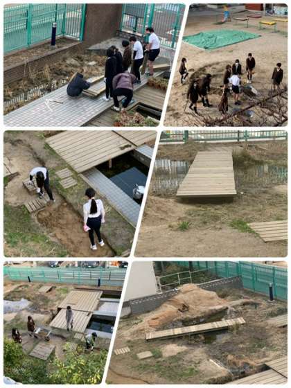 6年生がビオトープに橋を作りました。