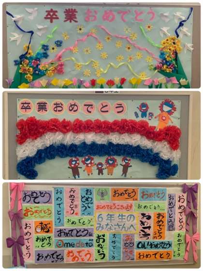 廊下、階段には卒業式の掲示がされ、学校もお祝いムードに包まれています。