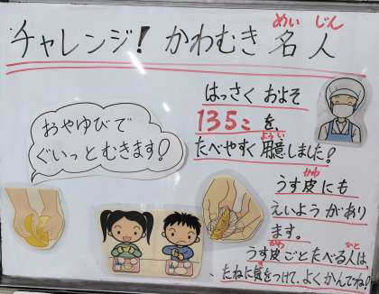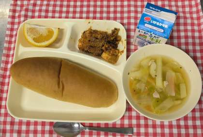 今日は、とうふのミートグラタン、じゃがいもと野菜のスープ、はっさく、黒糖パン、牛乳でした。はっさくは苦くて苦手な子もいましたが、皮むきにチャレンジして上手にむけると食べてみようという気持ちになってくれたようです。