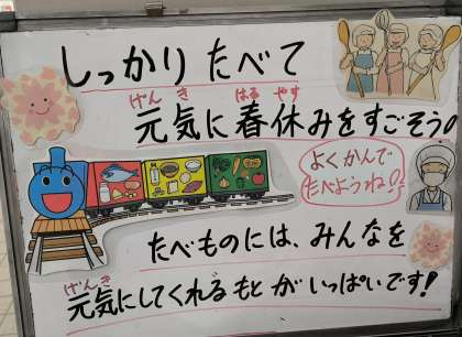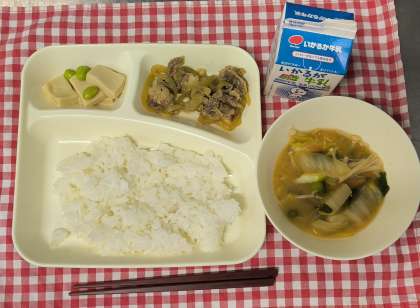 修了式の日の給食は、豚肉のしょうが焼き、みそ汁、高野豆腐の煮もの、ご飯、牛乳でした。最終日もみんなしっかり食べていました。