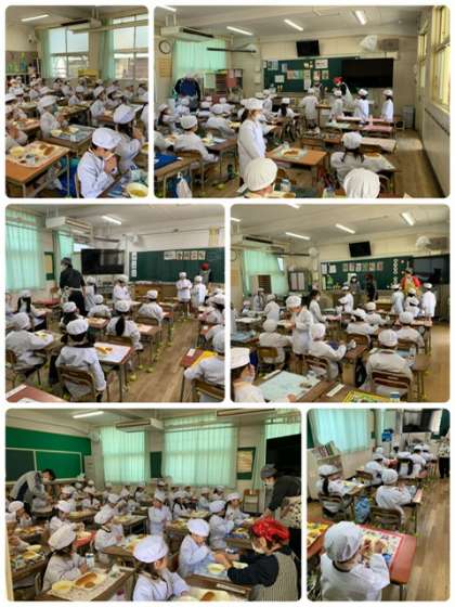 給食の準備の仕方や当番のお仕事について話を聞き、さぁ給食の時間。