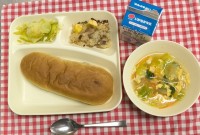 新しいクラスで最初の給食は、煮込みハンバーグ、コーンスープ、豆こんぶ、コッペパン、いちごジャム、牛乳でした。1年生も「おいしかった」と笑顔で話してくれました。