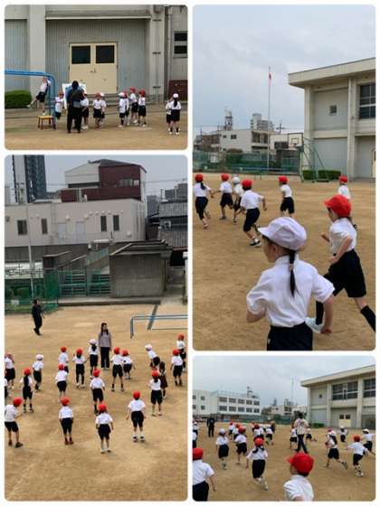運動場で体操をしたり、走ったり、うんていを練習したり。