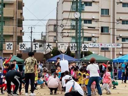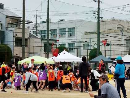 低学年の児童と一緒に先生たちも玉入れに参加しました!