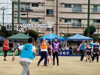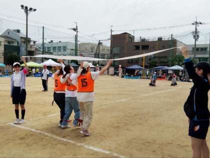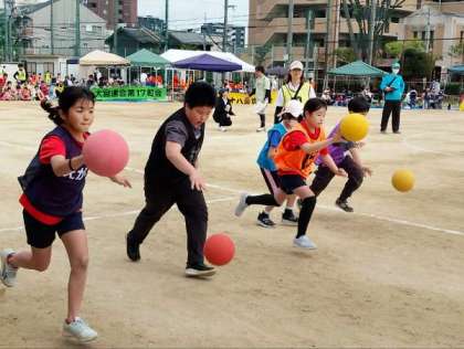 ドリブル → 2人1組でボールを運ぶ → 玉入れ → 3人4脚 → ゴール