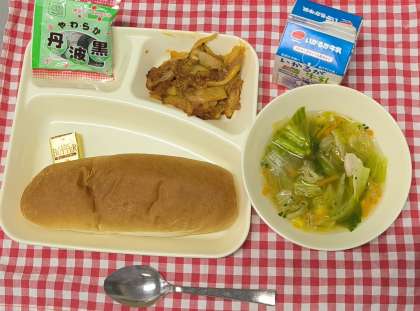 今日は、じゃがいものミートグラタン、レタスのスープ、ソフト黒豆、コッペパン、バター、牛乳でした。今日のグラタンは乳と小麦粉を使わずに作りました。「おいしい!」と好評でしたよ。