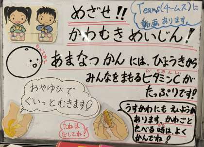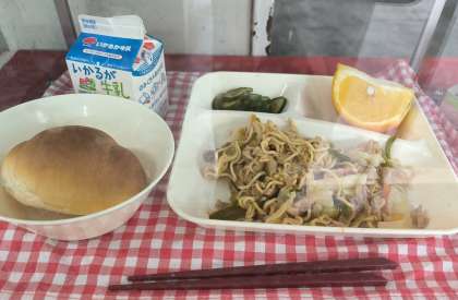 今日の給食は、焼きそば、きゅうりのしょうがづけ、あまなつかん、ミニコッペパン、牛乳でした。初めて甘夏柑を食べる1年生も多く、甘酸っぱい味にチャレンジしていました。薄皮を「自分でむけた!」と見せてくれる子もいました。ビタミンたっぷりの果物ご家庭でもおすすめです。