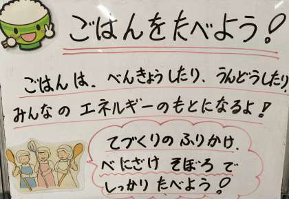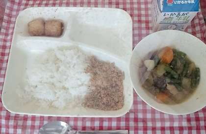 今日は、鶏肉とじゃがいもの煮もの、あつあげのしょうゆだれかけ、紅ざけそぼろ、ご飯、牛乳でした。給食ではご飯に添えるふりかけなども手作りで栄養たっぷりです。みんなご飯もしっかり食べていました。