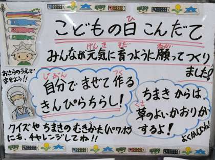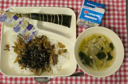 今日は少し早い子どもの日の行事献立で、きんぴらちらし、五目汁、ちまき、牛乳の組み合わせでした。自分で混ぜて作るちらし寿司やちまきに1年生もチャレンジしていました。