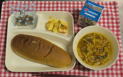 今日は、カレースープスパゲッティ、かぼちゃのマリネ、ミニフィッシュ、黒糖パン、牛乳でした。