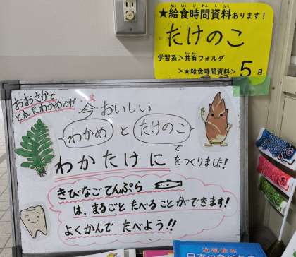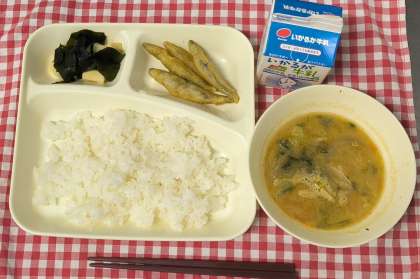 今日はきびなごてんぷら、みそ汁、わかたけ煮、ご飯、牛乳でした。